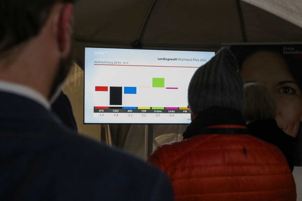 CDU teve desempenho ruim nos estados Baden-Württemberg e Renânia-Palatinado seis meses antes das eleições para o Congresso (Bundestagswahl), previstas para 26 de setembro. Políticos do partido da chanceler da Alemanha se envolveram em escândalos por suspeita de enriquecimento ilícito. Restrições em razão da Covid-19 e dificuldades de obtenção das vacinas acentuaram descontentamento. O partido conservador da chanceler alemã, Angela Merkel, enfraquecido pela crise sanitária e um escândalo financeiro, sofreu uma dura derrota em duas eleições regionais neste domingo (14), seis meses antes das legislativas, de acordo com pesquisas de boca de urna. A União Democrática Cristã (CDU) registrou "um desastre" eleitoral, segundo o jornal "Die Zeit"; uma "derrota" que mostra que "não pode continuar assim", escreveu a revista "Der Spiegel". Nas regiões de Baden-Württemberg e Renânia-Palatinado, o partido conservador obteve o pior resultado de sua história, segundo as projeções de boca de urna das emissoras ARD e ZDF. Pessoas acompanham os resultados das urnas na eleição estadual na cidade de Mainz, capital do estado Renânia-Palatinado, em 14 de março de 2021. Os alemães foram às urnas em duas eleições regionais importantes, em Renânia-Palatinado (em alemão, Rheinland-Pfalz) e Baden-Württemberg ARMANDO BABANI / AFP Em Baden-Württemberg, a CDU obteve 23,8% dos votos, contra 27% obtidos há cinco anos; enquanto na Renânia-Palatinado convenceu entre 26,9% e 27,5% dos eleitores, contra 31,8% em 2016, segundo ARD e ZDF. Embora os conservadores não fossem vistos como favoritos nesses dois estados regionais, liderados respectivamente pelos Verdes (Die Grünen) e pelos social-democratas (SPD), eles registraram um retrocesso notável a seis meses das eleições legislativas de 26 de setembro. As revelações em cascata sobre o chamado "caso das máscaras" e as críticas crescentes à gestão da crise de saúde anunciavam "sombrias perspectivas" eleitorais para os conservadores, opinou neste domingo o jornal popular "Bild". O CDU atravessa "sua crise mais grave" desde o escândalo das caixas pretas da queda do ex-chanceler Helmut Kohl no fim dos anos 90, estimam muitos cientistas políticos. Suspeita-se que dois deputados teriam recebido comissões pela compra de máscaras no início da pandemia do coronavírus, manchando a imagem do partido. Neste domingo à noite, o secretário-geral da CDU, Paul Ziemiak, disse que o partido terá "tolerância zero" para "qualquer um que tente enriquecer durante a crise". Segundo Ziemiak, o escândalo da máscara "teve um forte impacto" nos resultados das eleições regionais. Verdes e SPD lideram Cerca de 11 milhões de eleitores estavam aptos a votar na eleição parlamentar regional. Em Baden-Württemberg, uma região próspera e coração da indústria automobilística alemã, a vitória anunciada dos Verdes oferecerá um terceiro mandato a Winfried Kretschmann, de 72 anos, o único ambientalista que governa uma região alemã. Principal candidato dos Verdes, Winfried Kretschmann discursou enquanto os votos eram apurados em Stuttgart, no sul da Alemanha, no fim das eleições estaduais em Baden-Württemberg, em 14 de março de 2021 Marijan Murat / POOL / AFP A coalizão com o CDU, que dirige há cinco anos, costuma ser considerada o laboratório de uma possível aliança nacional entre esses dois partidos nas eleições de 26 de setembro. Os Verdes, que teriam vencido com cerca de 31% dos votos, segundo a pesquisa de boca de urna, terão assim uma boa margem para negociar uma nova aliança, com a CDU ou com os social-democratas, ou até com os liberais. Na região Renania-Palatinado, vizinha de França, Bélgica e Luxemburgo, as coisas também não deram certo para o partido da chanceler. Depois de acalentar a ideia de acabar com três décadas de dominação social-democrata, o CDU ficou muito atrás nas urnas da atual líder da região, Malu Dreyer, que obteve cerca de 34% dos votos e renovará seu mandato. Eleições estaduais na Renânia-Palatinado, na Alemanha: à direita, a candidata do Partido Social-Democrata (SPD) Malu Dreyer e, à esquerda, o candidato do partido conservador alemão CDU Christian Baldauf em 14 de março de 2021. ARMANDO BABANI / AFP Fartos das restrições Merkel, que esperava deixar o poder no auge de sua popularidade, vê seus planos contrariados pelas dificuldades do CDU e de seu aliado bávaro CSU. Dois deputados, Georg Nüsslein (CSU) e Nikolas Löbel (CDU), abandonaram nos últimos dias seus partidos respectivos por suspeitas de terem enriquecido graças à epidemia, ao agirem como intermediários com fabricantes na compra de máscaras. Em uma polêmica diferente, o conservador Mark Hauptmann renunciou na quinta-feira ao seu mandato depois de ser acusado de colocar publicidade do Azerbaijão no jornal regional que dirige. No passado, parlamentares do CDU foram acusados de receber dinheiro deste país rico em petróleo. Um deles perdeu recentemente a imunidade parlamentar. Em uma tentativa de apagar o incêndio, CDU e CSU deram o prazo até sexta-feira à noite aos seus parlamentares para declararem eventuais lucros com a epidemia. A polêmica chega no pior momento para os conservadores, que devem designar em breve seu candidato para a chanceleria. Armin Laschet, novo líder do CDU, aspira suceder Merkel, embora o presidente de Baviera, Markus Söder, possa ter a mesma ambição. O caso das máscaras aumentou ainda mais o cansaço de milhões de alemães com as restrições e que duvidam da estratégia do governo. As dificuldades de obtenção das vacinas contra a Covid-19 só têm acentuado o descontentamento, tendo como pano de fundo o aumento das infecções nos últimos dias. As autoridades de saúde não escondem sua preocupação com o possível início de uma terceira onda.